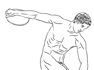 Illustration: Ca. 460–450 v. Chr. Der Diskobolos (Diskuswerfer) des griechischen Erzgießers Myron gehört zu den bekanntesten griechischen Statuen überhaupt. Er stellt vermutlich einen Sieger der Zehnkampfdisziplin Diskuswerfen dar.