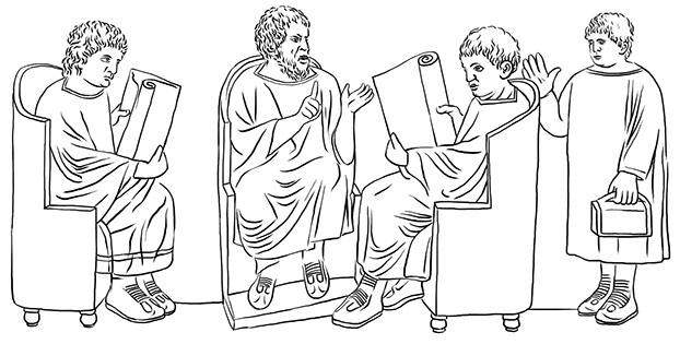 Illustration: Römisches Relief, gefunden in Neumagen in der Nähe von Trier, Ein Lehrer mit drei Schülern, 180-185 nach Christus