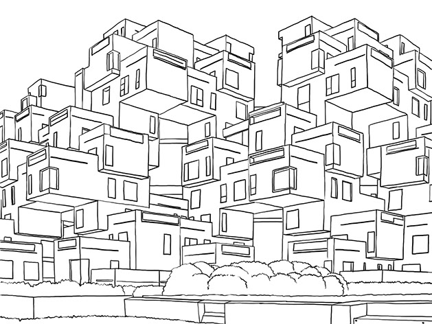 Illustration: Habitat 67 ist ein vom Architekten Moshe Safdie in den Jahren 1966 bis 1967 anlässlich der Weltausstellung erschaffener Wohnhaus-komplex in der kanadischen Stadt Montreal. »Der Gedanke der Siedlung war es, durch den konse-quenten Einsatz des Baukastenprinzips ein modernes und kostengünstiges Verfahren anzuregen.«
